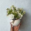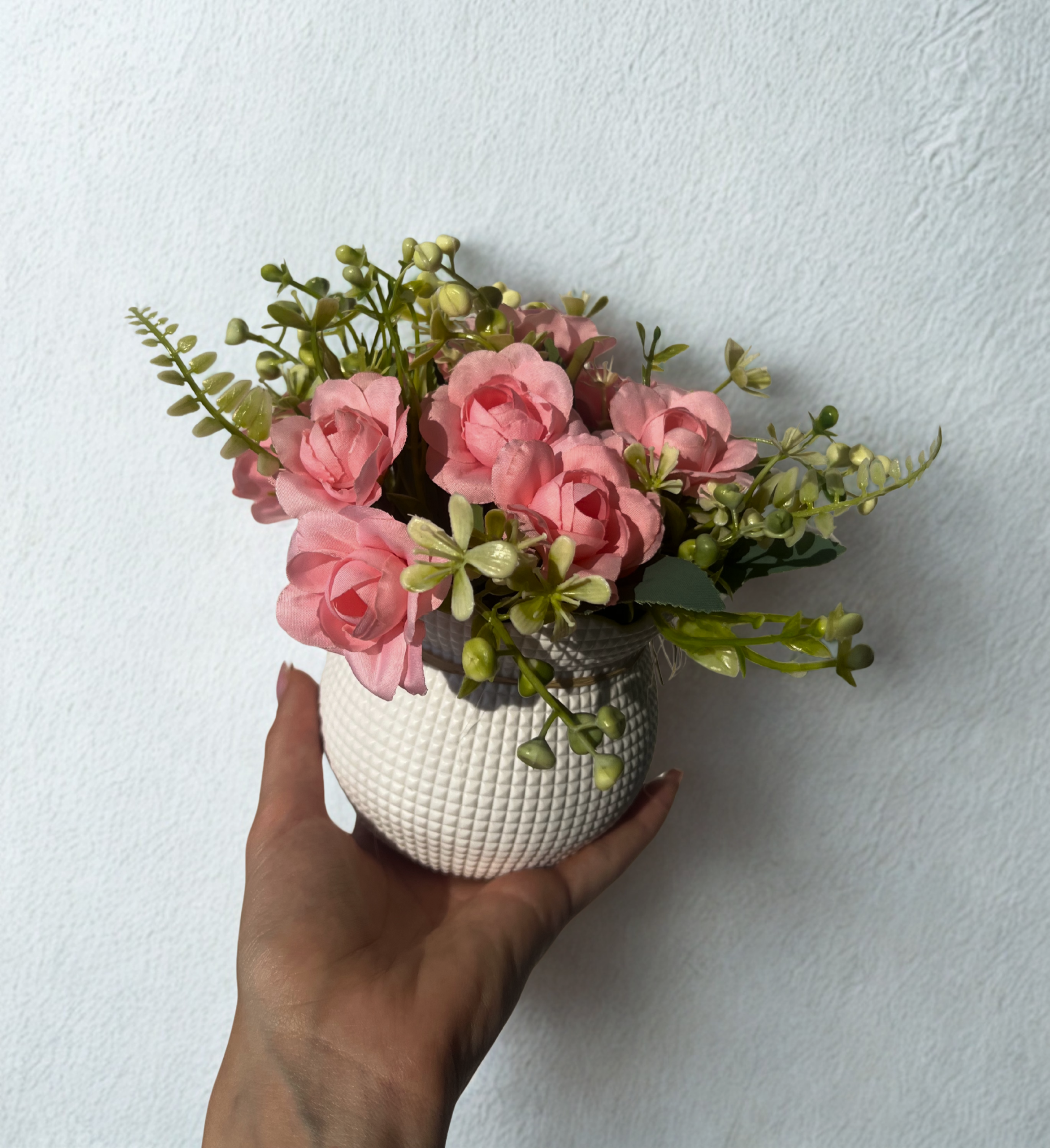 Loo oma koju õrn ja romantiline meeleolu selle kauni kunstlillega. Pehmetes virsikuroosades toonides roosid ja rohelised detailid on asetatud stiilsesse valgesse potti, mida kaunistab naturaalne nööripael. Ideaalne lisand elutuppa, magamistuppa või kingituseks kallimale.