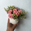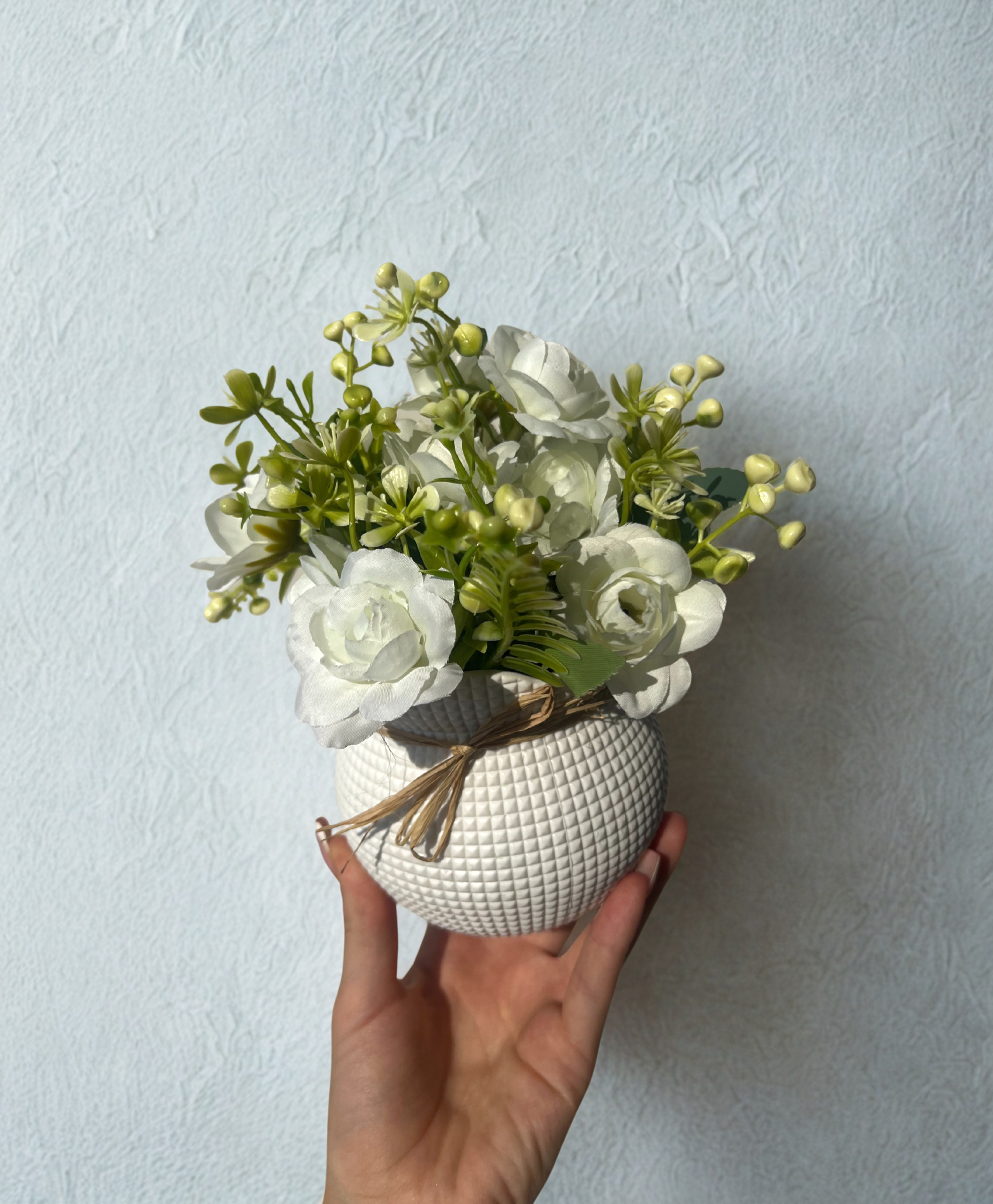 Loo oma koju õrn ja romantiline meeleolu selle kauni kunstlillega. Pehmetes virsikuroosades toonides roosid ja rohelised detailid on asetatud stiilsesse valgesse potti, mida kaunistab naturaalne nööripael. Ideaalne lisand elutuppa, magamistuppa või kingituseks kallimale.