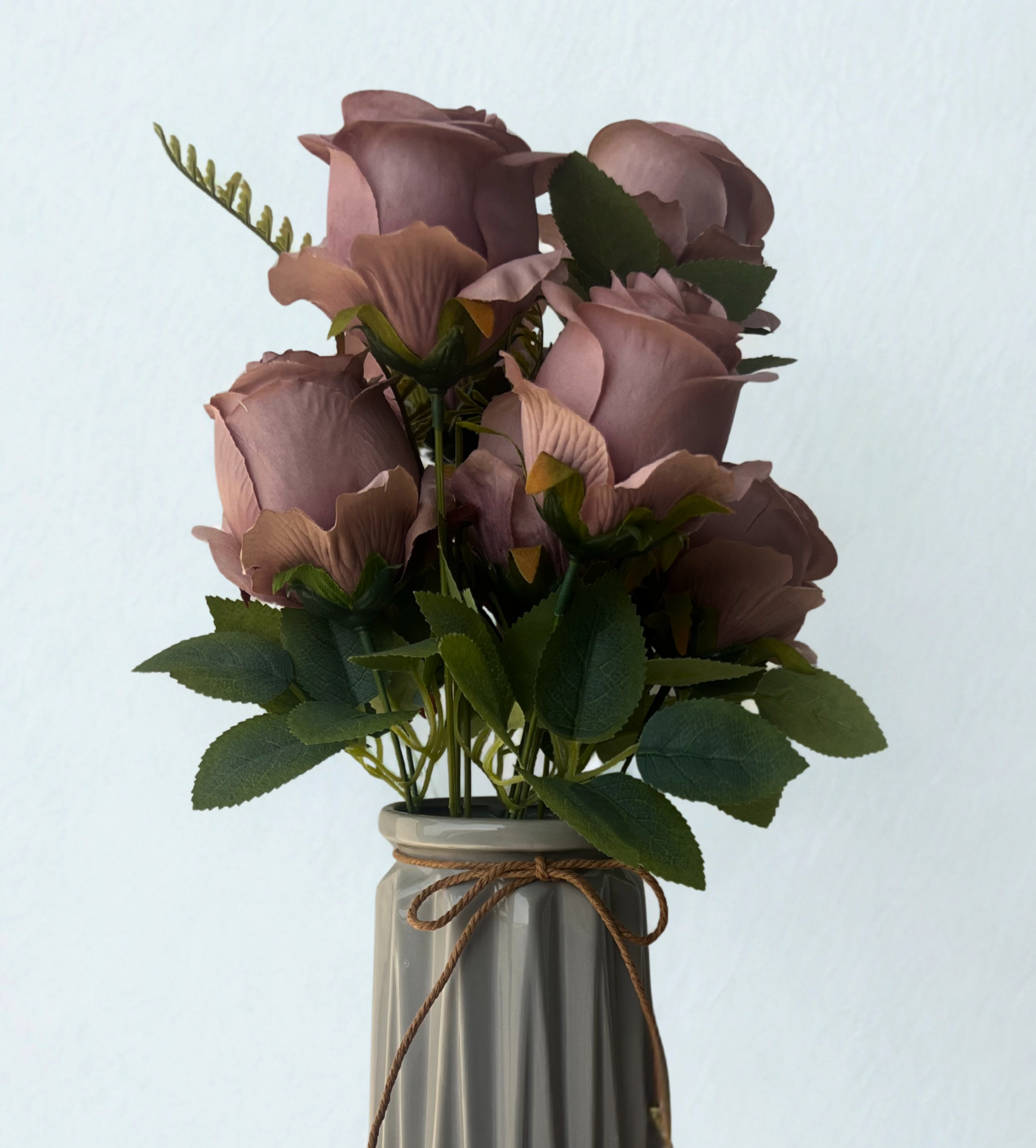 Kaunis dekoratiivne roosikimp, mis lisab igasse ruumi õrnust ja elegantsi. Vanaroosad roosiõied on kombineeritud roheliste lehtede ja pungadega, luues loomuliku ja värske ilme. Lilled on valmistatud kvaliteetsest siidist ja plastist, mis tagab realistliku välimuse ja pika kestvuse.