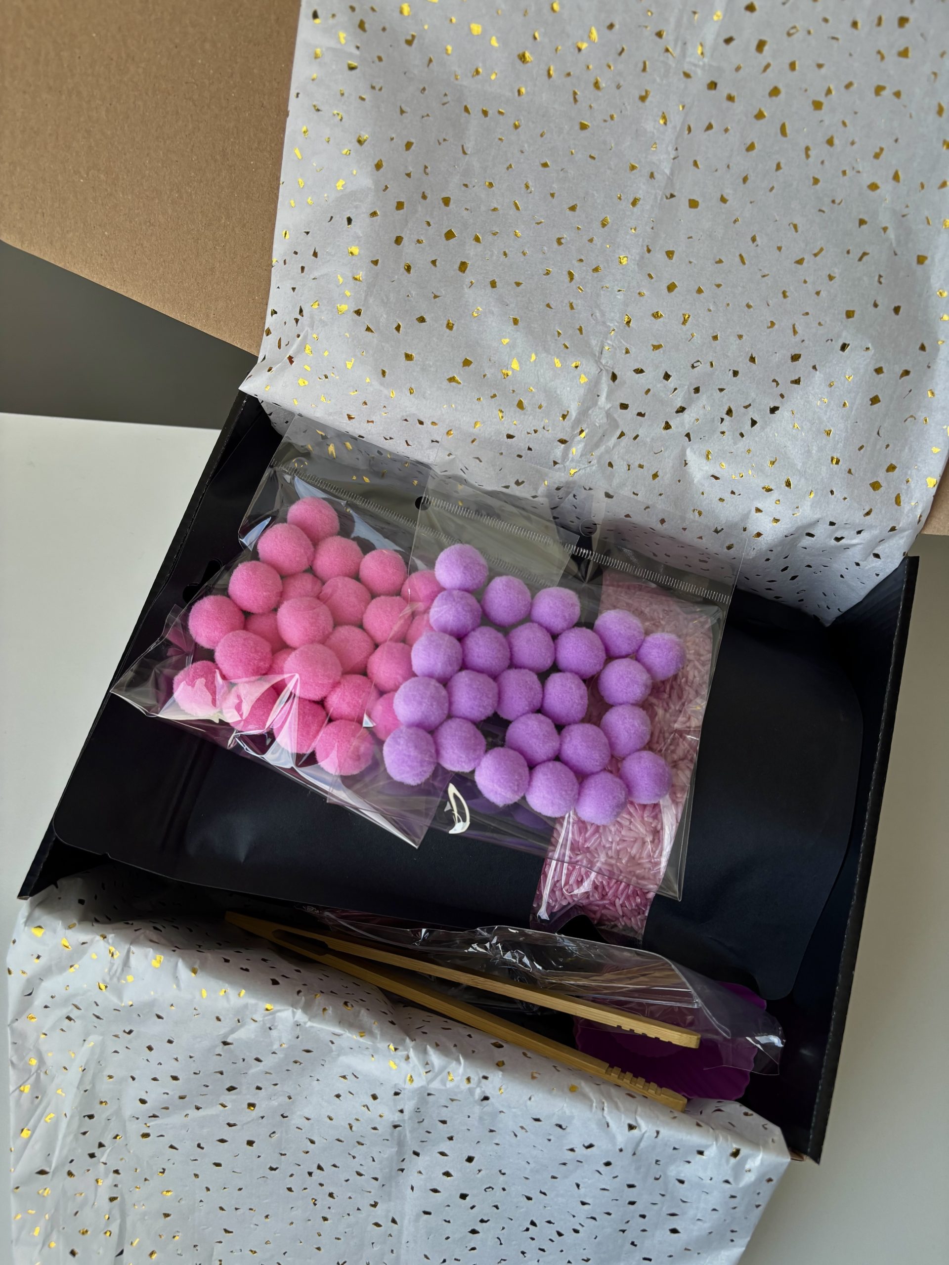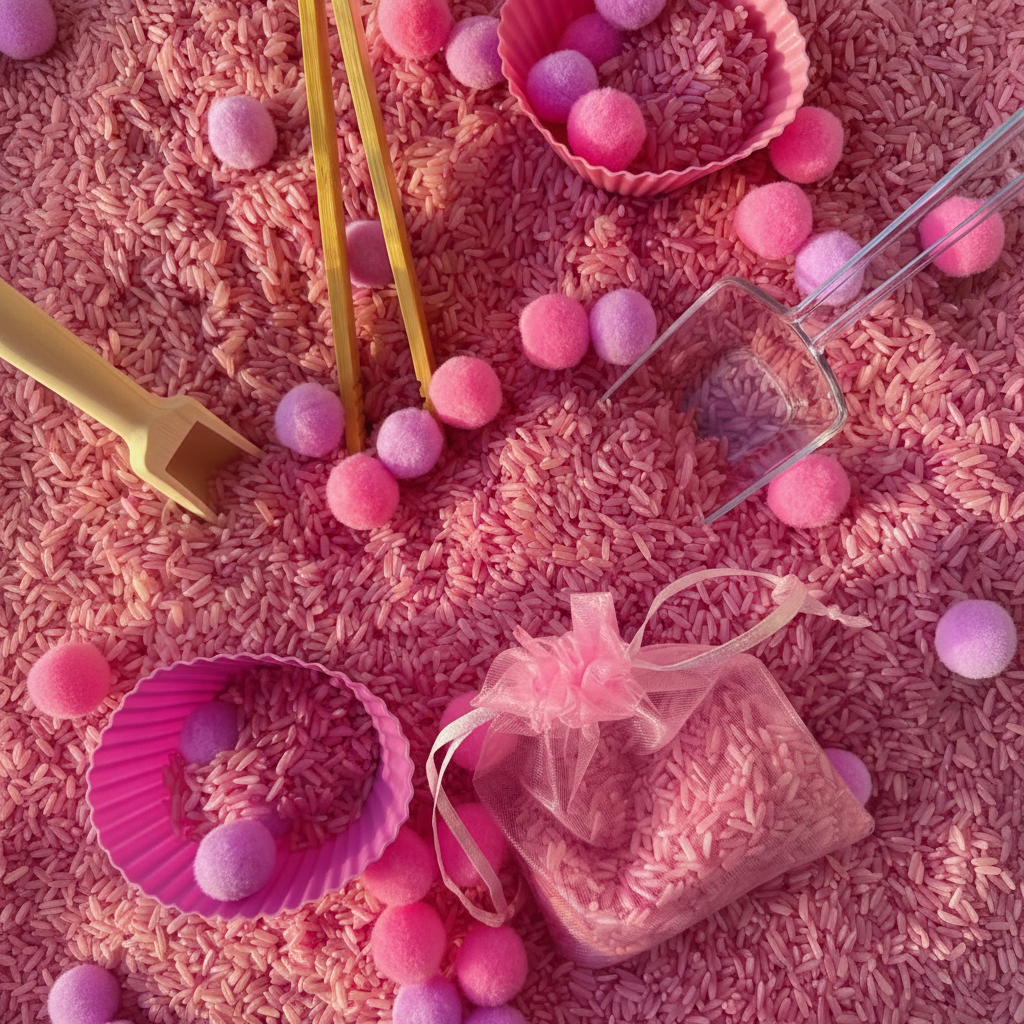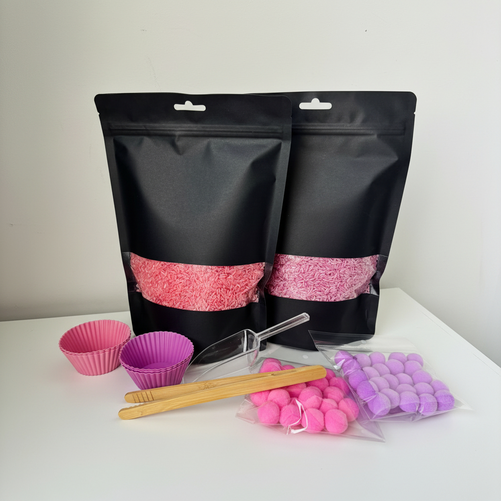See valmis sensoorne mängukomplekt pakub lapsele arendavat ja loovat tegevust ühes karbis. Komplekt sisaldab kaks pakki (800g x 2) värvilist sensoorset riisi, pehmeid pom-pom pallikesi, kühvlit, pintsette ning silikoonist vorme – kõik vajalik põnevaks avastamiseks ja sorteerimiseks.