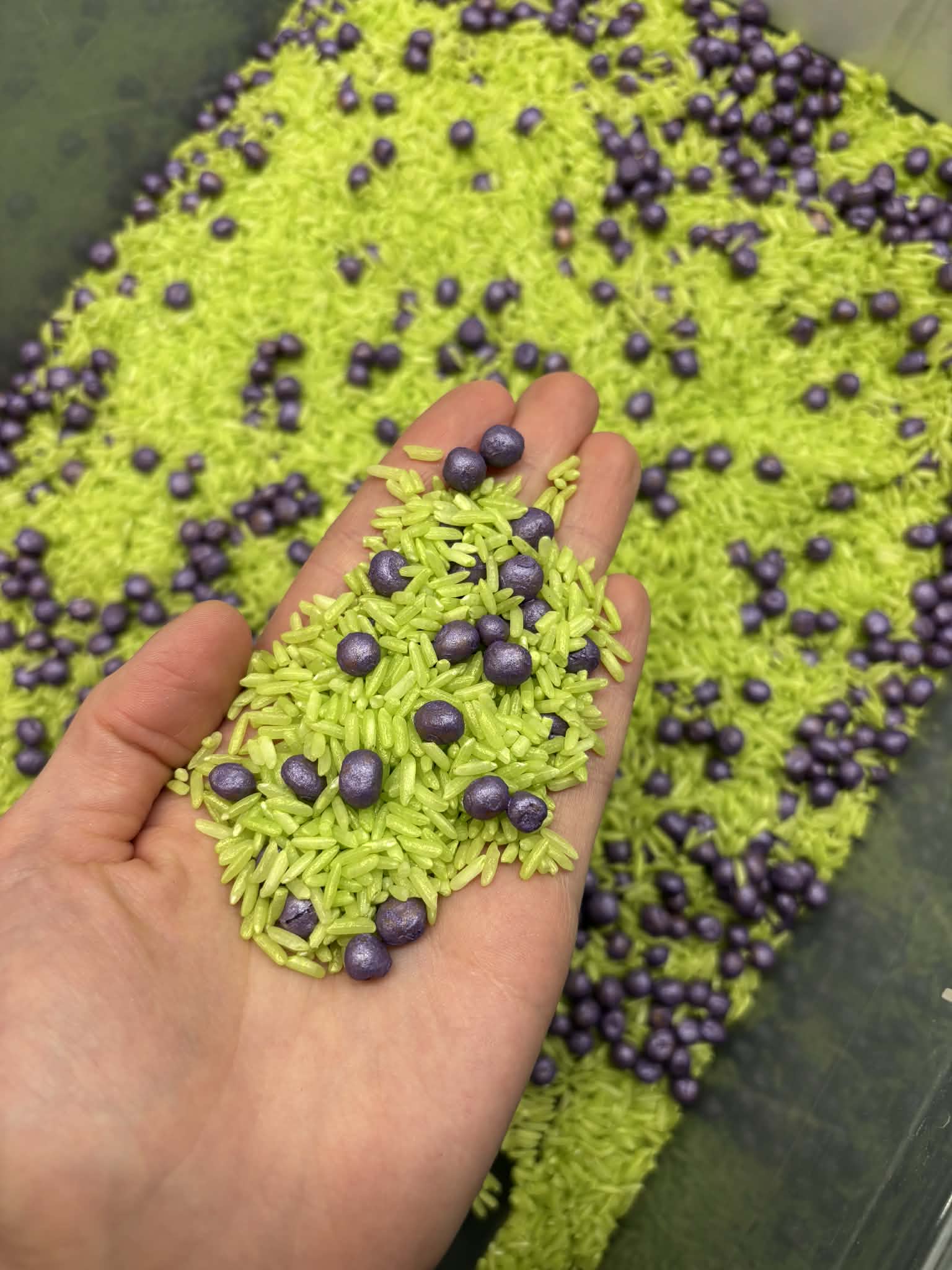 See värviline sensoorne segu koosneb riisist ja kuivatatud hernestest, pakkudes lapsele mitmekesist ja huvitavat mängukogemust. Erinevad suurused ja tekstuurid muudavad mängu põnevaks ning kutsuvad last avastama, sorteerima ja katsetama.