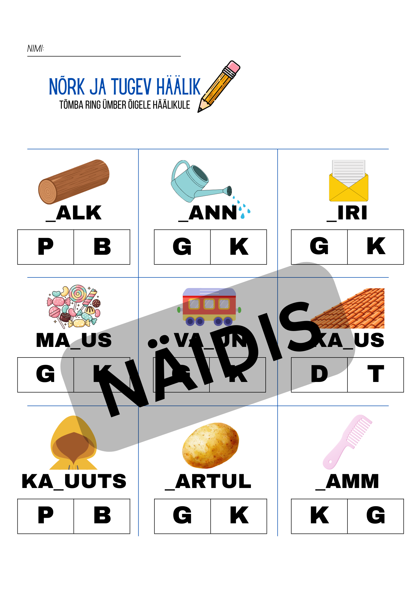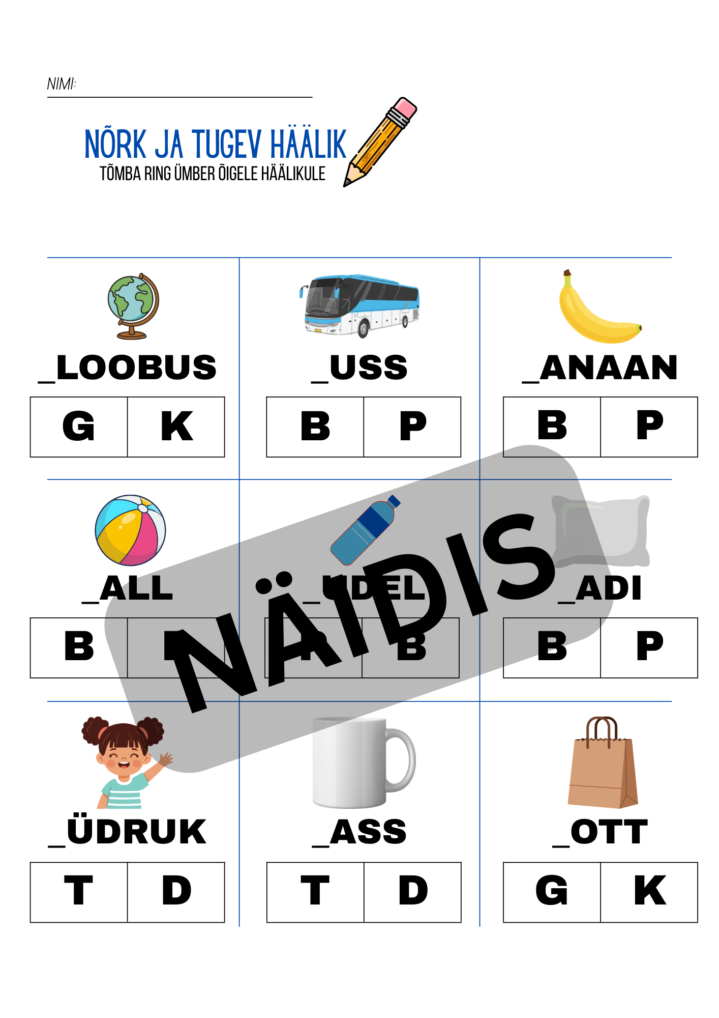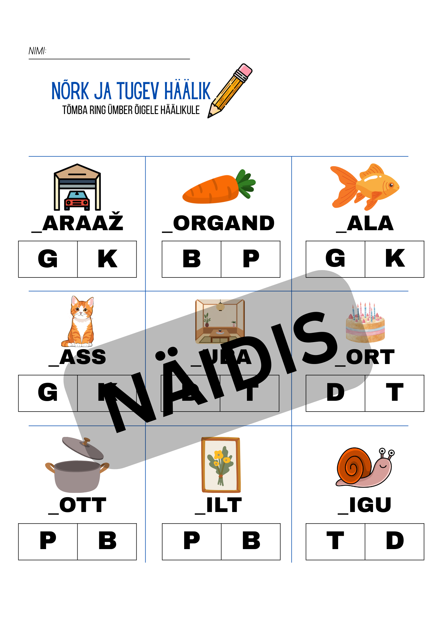 See arendav tööleht aitab lapsel õppida eristama nõrka ja tugevat häälikut sõna alguses ja keskel. Ülesandeks on tõmmata ring ümber õigele häälikule, toetades nii hääliku kuulamist, lugemisoskuse kujunemist kui ka õigekirja mõistmist.